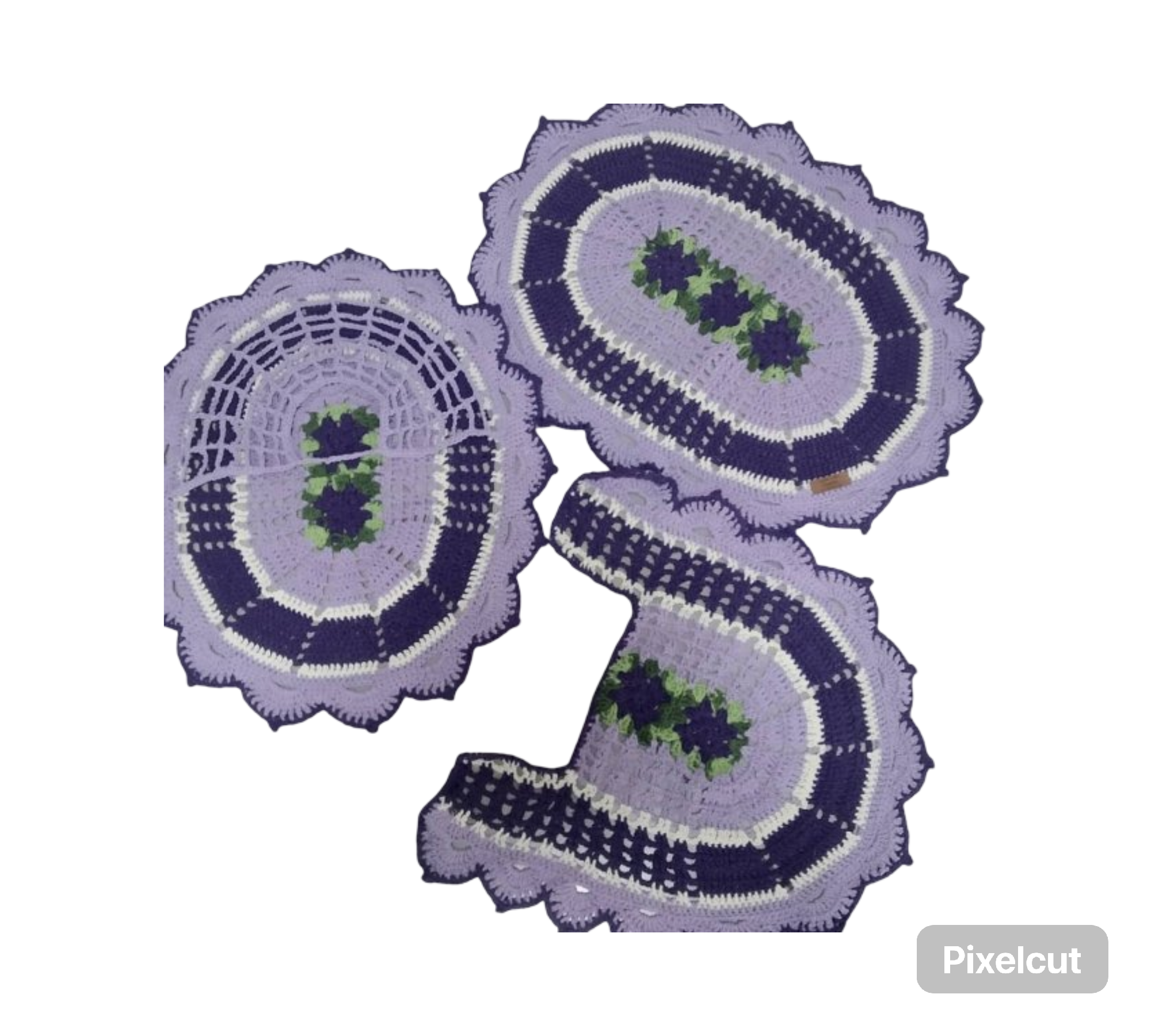 Conjunto de Tapetes em Crochê – 3 Peças para Banheiro. Transforme seu banheiro com o charme artesanal deste conjunto de tapetes em crochê, feito à mão com todo cuidado e capricho. Composto por 3 peças, ele oferece beleza, conforto e praticidade no dia a dia: