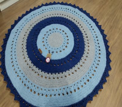 Tapete redondo em tons azuis. Feito com barbante de qualidade Euroroma ecológico. Medidas 100 diâmetro