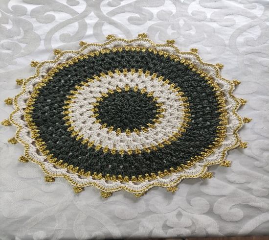 Transforme sua mesa posta em um verdadeiro cenário de encanto com o Sousplat Natalino Realeza. Produzido com acabamento impecável, ele combina as cores verde oliva, cru e dourado, trazendo um visual elegante e sofisticado para as celebrações de fim de ano.